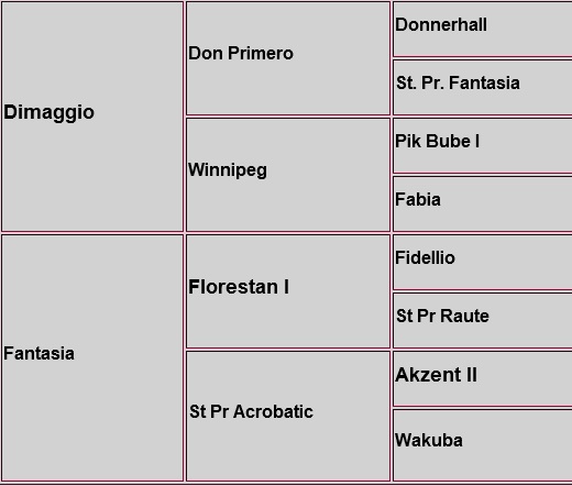 His dam sire, Florestan, was champion at the 1988 Rhinelander Stallion Licensing and won the Stallion Performance Test in Warendorf the following year with 129,02 points. He sired 88 approved sons and more than 2000 offspring are registered as sport horses. Many of them are World Young Horse Champions, Bundeschampions as well as Grand Prix horses: e.g. French Kiss, Fazzino, Florencio, Fidermark, Furst Fabio, Ferrara, Torricelli, etc.